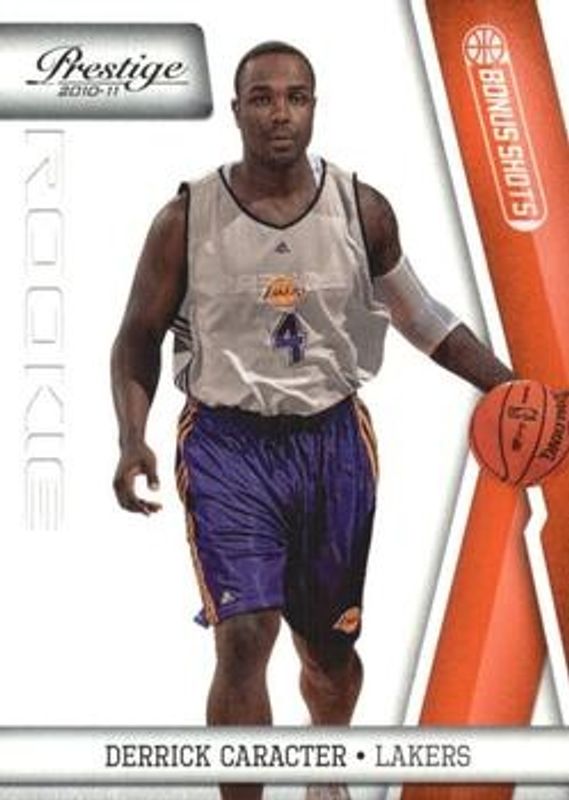 The Derrick Caracter 2010 Prestige #208 Bonus Shots Orange /499 Rookie card is 1 of 7 Derrick Caracter's card variations in the 2010 Prestige set being tracked by Sports Card Investor, including Base, Bonus Shots Gold /249, Bonus Shots Purple /49, Bonus Shots Green /25, and Bonus Shots Black /10.