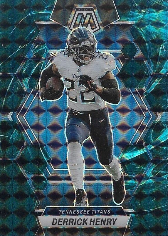 This card is 1 of 10 Derrick Henry's card variations in the 2023 Mosaic set being tracked by Sports Card Investor, including Choice Peacock /(SSP), Honeycomb /(SSP), White Sparkle /(SSP), No Huddle Gold /10, and Black /1.