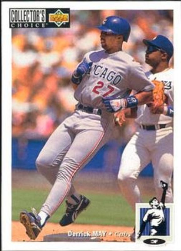The Derrick May 1994 Upper Deck Collector's Choice #193 Base card is 1 of 3 Derrick May's card variations in the 1994 Upper Deck Collector's Choice set being tracked by Sports Card Investor, including Gold Signatures, and Silver Signatures.