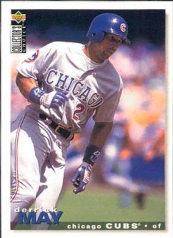 The Derrick May 1995 Upper Deck Collector's Choice #209 Base card is 1 of 4 Derrick May's card variations in the 1995 Upper Deck Collector's Choice set being tracked by Sports Card Investor, including Base, Gold Signatures, and Silver Signatures.