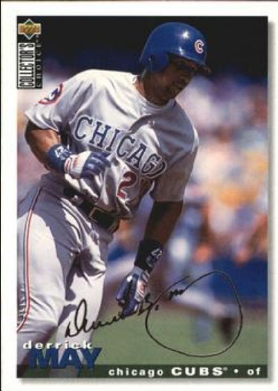 The Derrick May 1995 Upper Deck Collector's Choice #209 Silver Signatures card is 1 of 4 Derrick May's card variations in the 1995 Upper Deck Collector's Choice set being tracked by Sports Card Investor, including #209 Base, #538 Base, and #209 Gold Signatures.
