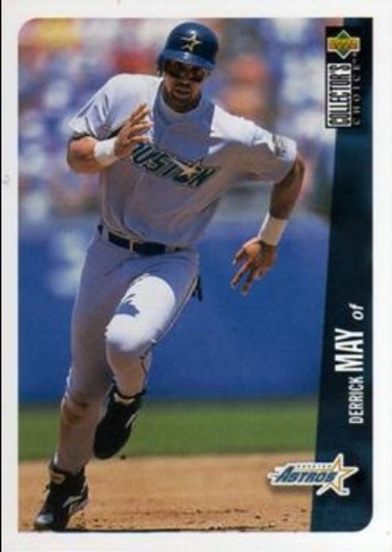 The Derrick May 1996 Upper Deck Collector's Choice #567 Base card is 1 of 3 Derrick May's card variations in the 1996 Upper Deck Collector's Choice set being tracked by Sports Card Investor, including Gold Signatures, and Silver Signatures.