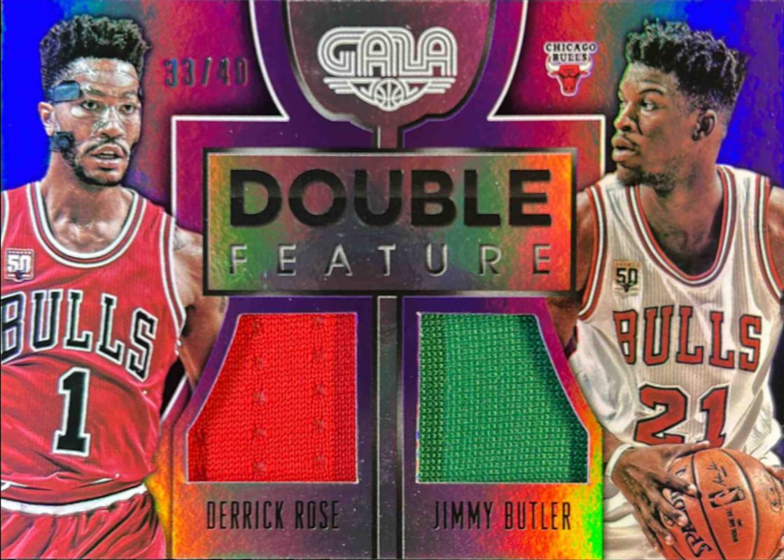 The Derrick Rose / Jimmy Butler 2015 Gala #30 Double Feature Memorabilia Purple /40 card is 1 of 5 Derrick Rose / Jimmy Butler's card variations in the 2015 Gala set being tracked by Sports Card Investor, including Double Feature Memorabilia /60, Double Feature Memorabilia Jade /25, Double Feature Memorabilia Crimson /5, and Double Feature Memorabilia Midnight /1.