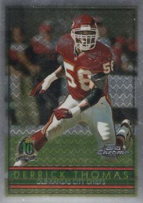 The Derrick Thomas 1996 Topps Chrome #69 Base card is 1 of 2 Derrick Thomas' card variations in the 1996 Topps Chrome set being tracked by Sports Card Investor, including Refractor.
