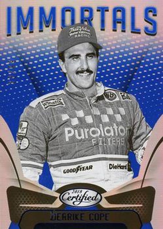 The Derrike Cope 2018 Certified NASCAR #84 Blue /20 card is 1 of 12 Derrike Cope's card variations in the 2018 Certified NASCAR set being tracked by Sports Card Investor, including Base /149, Orange /249, Mirror Gold /25, Red /25, and Gold /15.