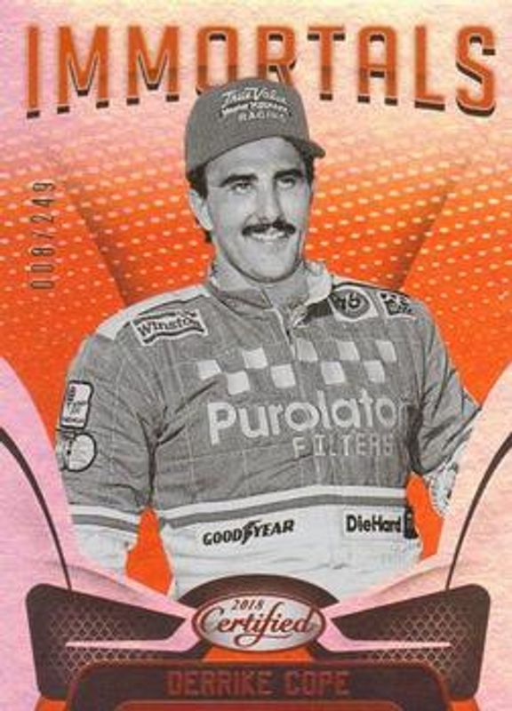 The Derrike Cope 2018 Certified NASCAR #84 Orange /249 card is 1 of 12 Derrike Cope's card variations in the 2018 Certified NASCAR set being tracked by Sports Card Investor, including Base /149, Mirror Gold /25, Red /25, Blue /20, and Gold /15.