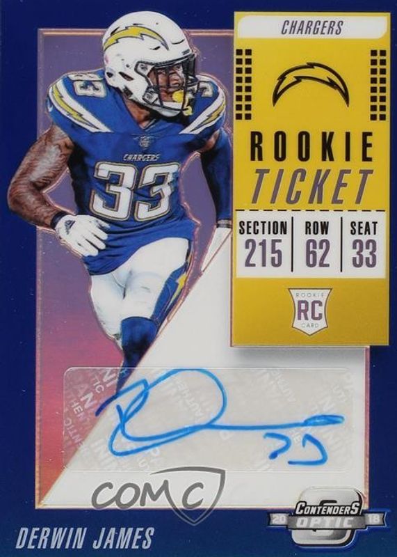The Derwin James 2018 Contenders Optic #149 Rookie Ticket Auto - Blue (/25) card in Raw condition has not changed in price in the last 30 days and was last sold for $47.00 .
