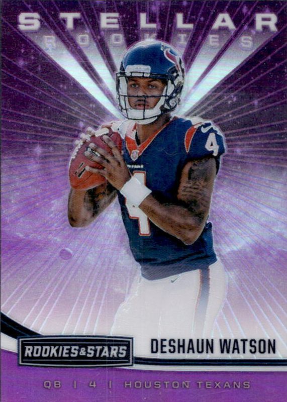 The Deshaun Watson 2017 Rookies & Stars #1 Stellar Rookies - Purple /49 card in Raw condition has not changed in price in the last 30 days and was last sold for $10.13 .