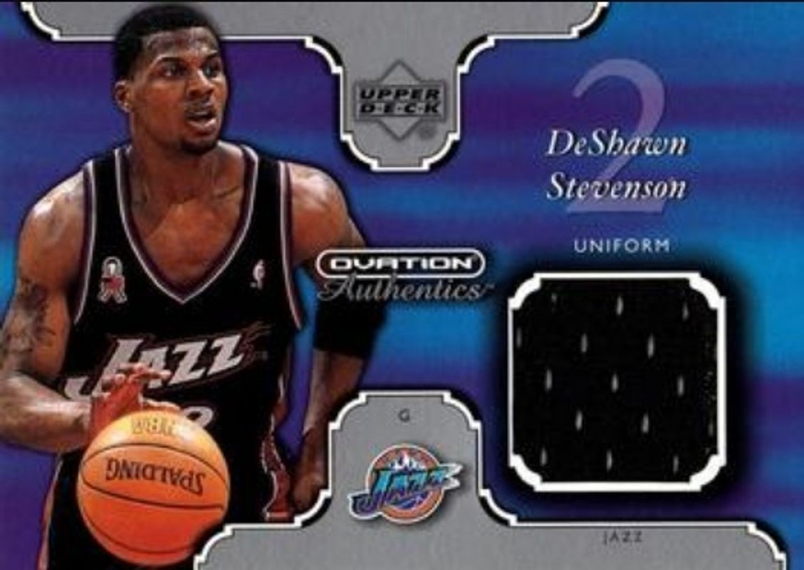 The DeShawn Stevenson 2002 Upper Deck Ovation #DS-U Authentics Uniform card is 1 of 2 DeShawn Stevenson's card variations in the 2002 Upper Deck Ovation set being tracked by Sports Card Investor, including Authentics Uniform Gold /25.