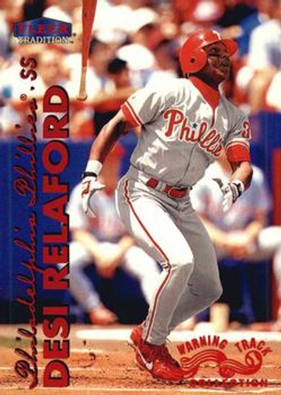 The Desi Relaford 1999 Fleer Tradition #306W Warning Track Collection card is 1 of 4 Desi Relaford's card variations in the 1999 Fleer Tradition set being tracked by Sports Card Investor, including Base, Millennium, and Starting 9 /9.