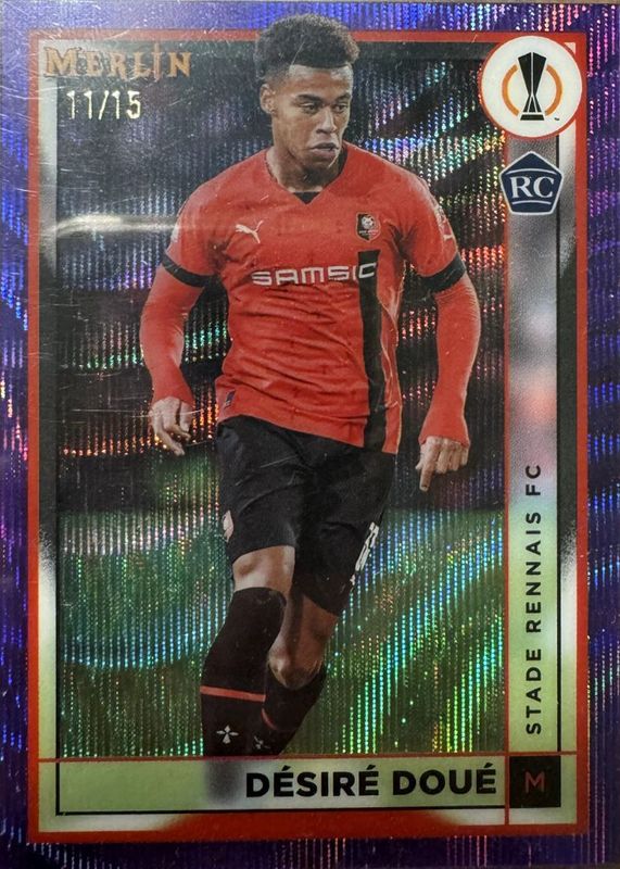 The Desire Doue 2022 Topps Merlin Chrome UEFA Club Competitions #133 Purple Wave Refractor /15 Rookie card in Raw condition has not changed in price in the last 30 days and was last sold for $626.00 .