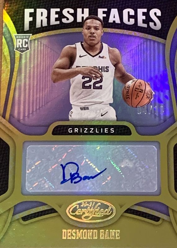 The Desmond Bane 2020 Certified #FS-BAN Fresh Faces Signatures - Gold /10 Rookie card in Raw condition has not changed in price in the last 30 days and was last sold for $48.00 .