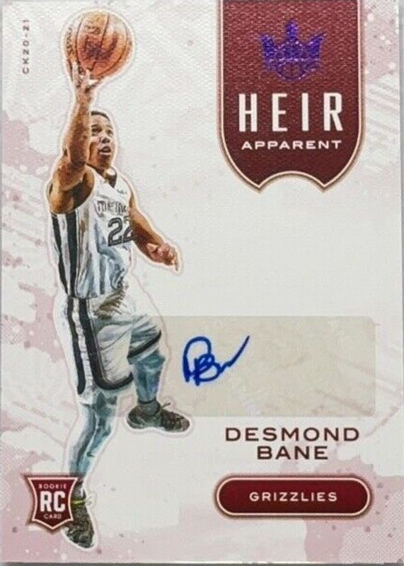 The Desmond Bane 2020 Court Kings #HA-DBA Heir Apparent Autographs - Violet (/35) Rookie card in Raw condition has not changed in price in the last 30 days and was last sold for $27.00 .