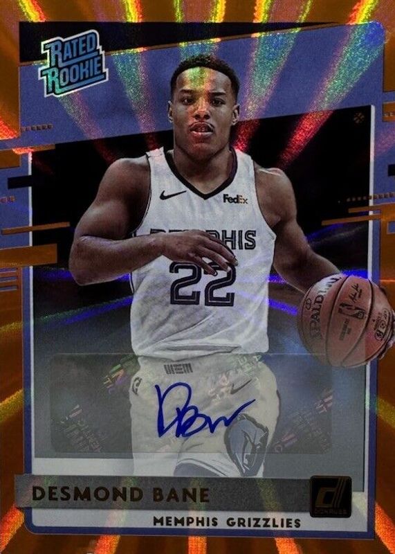 The Desmond Bane 2020 Donruss #240 Rated Rookie Signatures - Holo Orange Laser card in Raw condition has not changed in price in the last 30 days and was last sold for $45.00 .