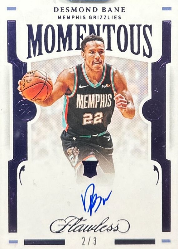 The Desmond Bane 2020 Flawless #MOM-BAN Momentous Autographs - Amethyst /3 Rookie card in Raw condition has not changed in price in the last 30 days and was last sold for $489.00 .