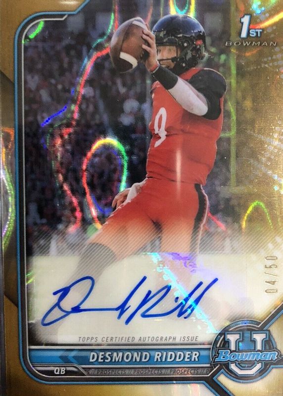This card is 1 of 11 Desmond Ridder's card variations in the 2021 Bowman University set being tracked by Sports Card Investor, including Chrome Prospect Auto - Refractor (1st), Chrome Prospect Auto - Lava Refractor /199 (1st), Chrome Prospect Auto - Green Refractor /99 (1st), Chrome Prospect Auto - Yellow Refractor /75 (1st), and Chrome Prospect Auto - Gold Refractor /50 (1st).