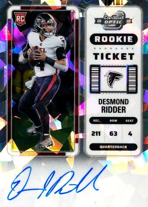 The Desmond Ridder 2022 Contenders Optic #114 Rookie Ticket Auto - Cracked Ice Ticket /22 card in Raw condition has not changed in price in the last 30 days and was last sold for $1,708.50 .
