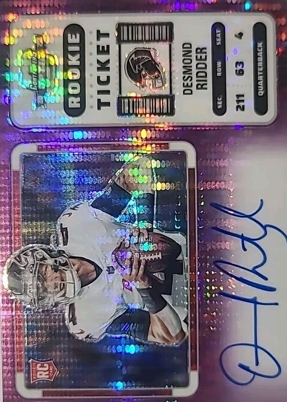 The Desmond Ridder 2022 Contenders Optic #114 Rookie Ticket Auto Variation - Purple Pulsar /21 card in Raw condition has not changed in price in the last 30 days and was last sold for $19.49 .