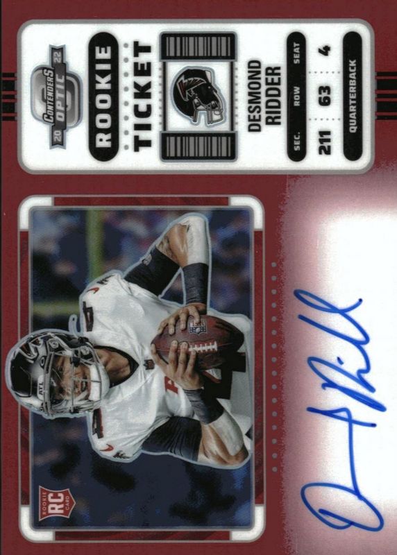 The Desmond Ridder 2022 Contenders Optic #114 Rookie Ticket Auto Variation - Red /50 card in Raw condition has not changed in price in the last 30 days and was last sold for $3.75 .