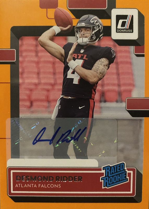 The Desmond Ridder 2022 Donruss #304 Rated Rookie Autographs - Orange card in Raw condition has not changed in price in the last 30 days and was last sold for $16.01 .