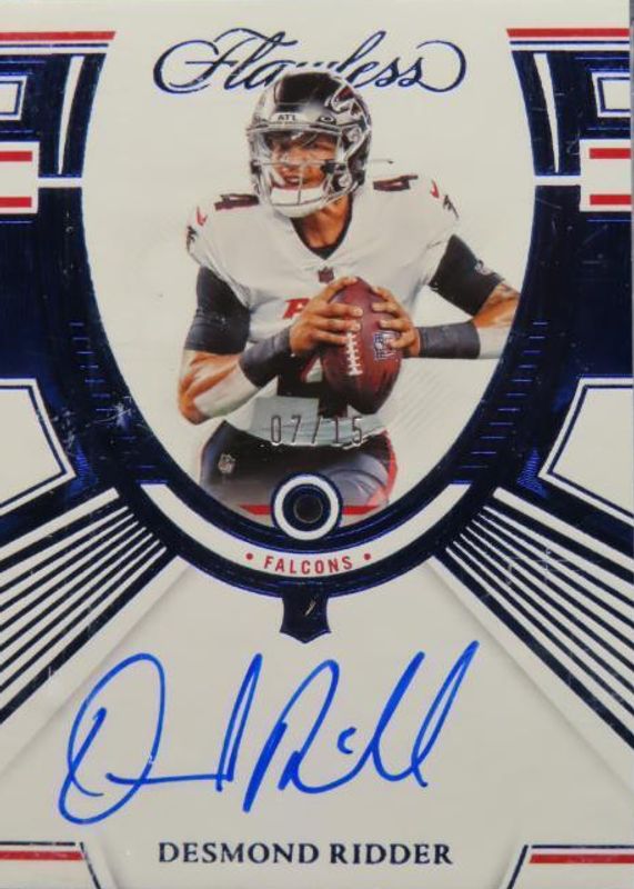The Desmond Ridder 2022 Flawless #RGM-DR Rookie Gems Signatures - Sapphire /15 card in Raw condition has not changed in price in the last 30 days and was last sold for $76.00 .
