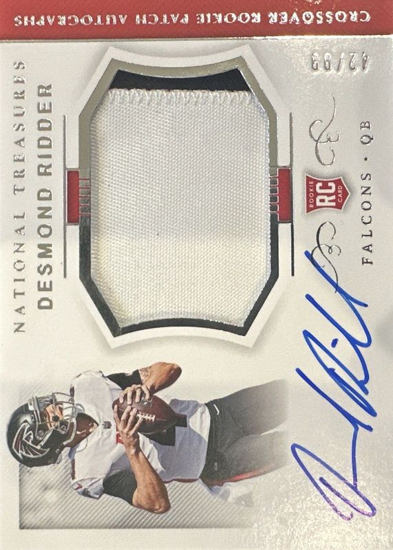 The Desmond Ridder 2022 National Treasures #CRPA-DR Crossover Rookie Patch Autographs (/99) card in Raw condition has not changed in price in the last 30 days and was last sold for $10.37 .