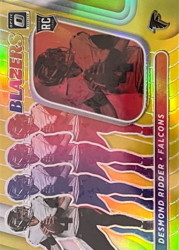 The Desmond Ridder 2022 Optic #B-14 Blazers - Gold /10 Rookie card in Raw condition has not changed in price in the last 30 days and was last sold for $152.51 .