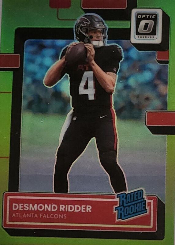 The Desmond Ridder 2022 Optic #202 Lime Green /35 Rookie card in Raw condition has not changed in price in the last 30 days and was last sold for $5.00 .