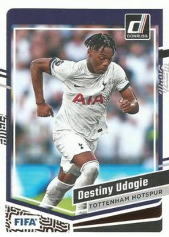 The Destiny Udogie 2023 Donruss #107 Base card is 1 of 38 Destiny Udogie's card variations in the 2023 Donruss set being tracked by Sports Card Investor, including Optic, Cubic, Diamond, Optic - Argyle, and Optic - Holo.