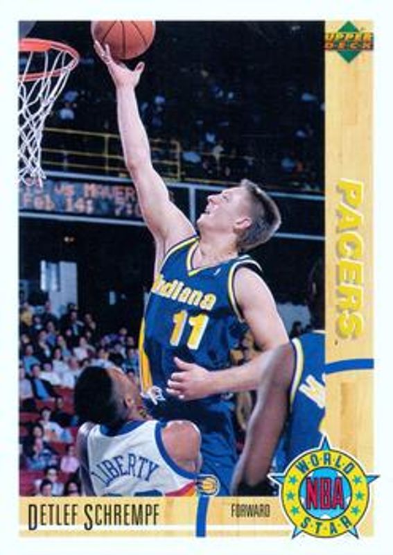 The Detlef Schrempf 1991 Upper Deck Spanish #189 Base card is 1 of 3 Detlef Schrempf's card variations in the 1991 Upper Deck Spanish set being tracked by Sports Card Investor, including Base, and International Award Winner Holograms.