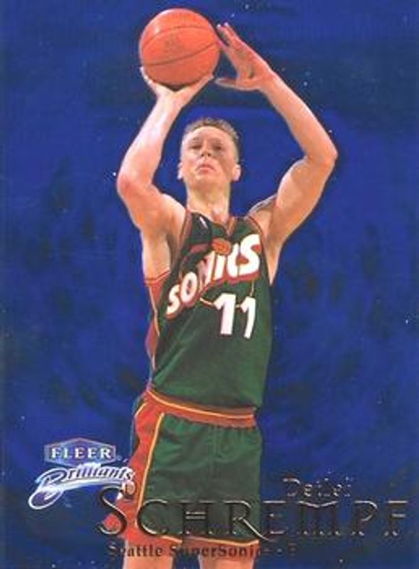 The Detlef Schrempf 1998 Fleer Brilliants #98B Blue card is 1 of 4 Detlef Schrempf's card variations in the 1998 Fleer Brilliants set being tracked by Sports Card Investor, including Base, Gold /99, and 24-Karat Gold /24.