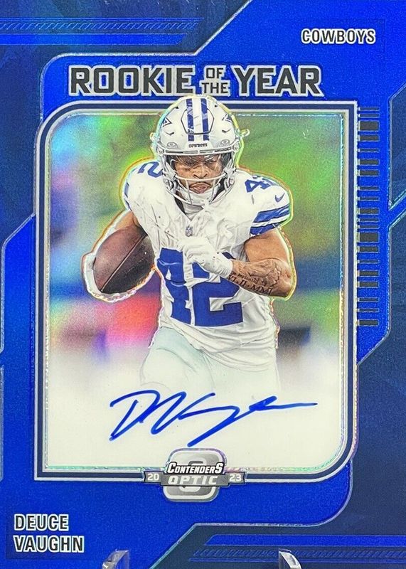The Deuce Vaughn 2023 Contenders Optic #ROY-DV Rookie of the Year Contenders Autographs - Blue (/75) card in Raw condition has not changed in price in the last 30 days and was last sold for $22.05 .