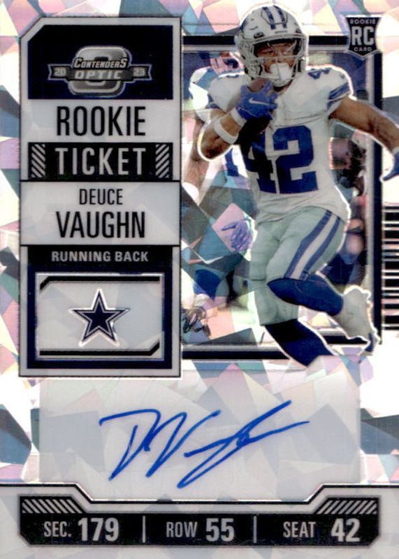 This card is 1 of 38 Deuce Vaughn's card variations in the 2023 Contenders Optic set being tracked by Sports Card Investor, including Rookie of the Year Contenders Autographs (/99), Rookie of the Year Contenders Autographs - Blue (/75), Rookie Ticket Auto, Rookie Ticket Auto - Red (/125), and Rookie Ticket Auto - Silver.