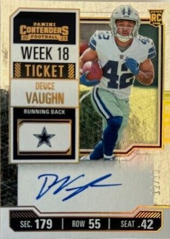 The Deuce Vaughn 2023 Contenders #108 Rookie Ticket Auto - Week 18 /18 card in Raw condition has not changed in price in the last 30 days and was last sold for $15.50 .