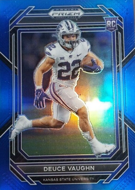 The Deuce Vaughn 2023 Prizm Draft Picks #126 Blue /199 Rookie card in Raw condition has not changed in price in the last 30 days and was last sold for $3.50 .