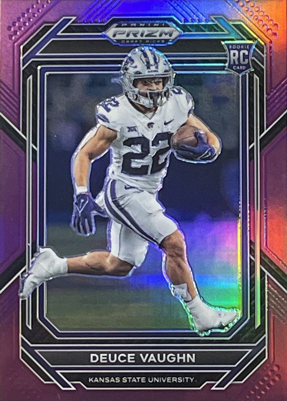 The Deuce Vaughn 2023 Prizm Draft Picks #126 Purple /75 Rookie card in Raw condition has not changed in price in the last 30 days and was last sold for $40.00 .