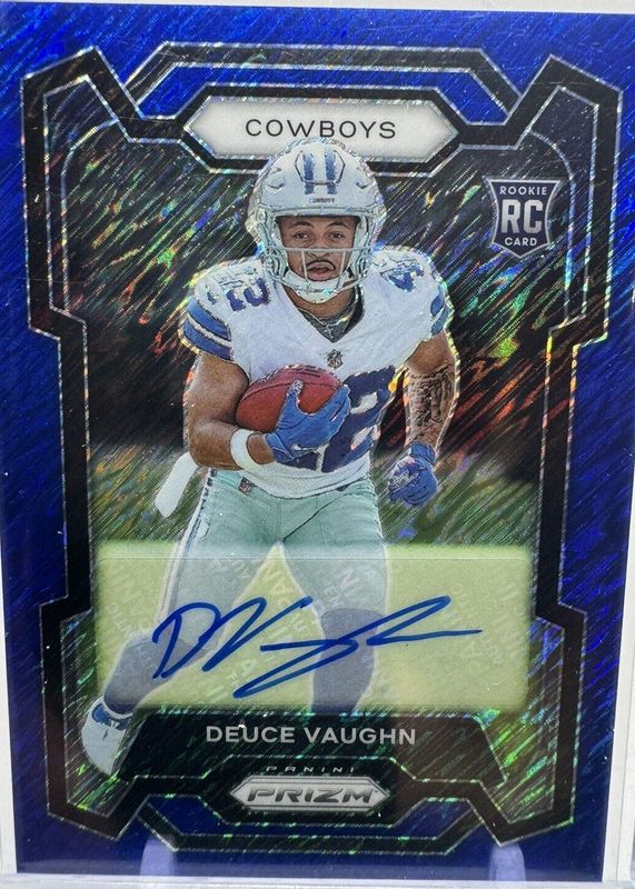 The Deuce Vaughn 2023 Prizm #324 Rookie Autographs - Blue Shimmer /25 card in Raw condition has not changed in price in the last 30 days and was last sold for $69.00 .