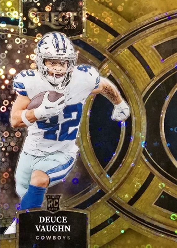 The Deuce Vaughn 2023 Select #128 Premier Level Gold Disco /10 Rookie card in Raw condition has not changed in price in the last 30 days and was last sold for $22.50 .