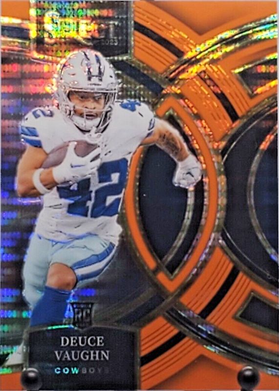 The Deuce Vaughn 2023 Select #128 Premier Level Neon Orange Pulsar /7 Rookie card in Raw condition has not changed in price in the last 30 days and was last sold for $11.50 .