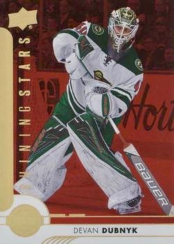 The Devan Dubnyk 2017 Upper Deck #SSG-5 Shining Stars - Red card is 1 of 18 Devan Dubnyk's card variations in the 2017 Upper Deck set being tracked by Sports Card Investor, including Base, Clear Cut, Gold Rainbow Foil, Silver Foil, and UD Exclusives /100.