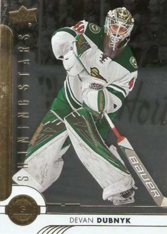 The Devan Dubnyk 2017 Upper Deck #SSG-5 Shining Stars card is 1 of 18 Devan Dubnyk's card variations in the 2017 Upper Deck set being tracked by Sports Card Investor, including Base, Clear Cut, Gold Rainbow Foil, Silver Foil, and UD Exclusives /100.