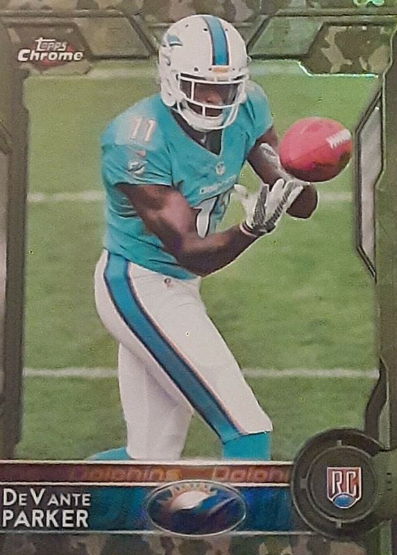 DeVante Parker's Football cards are available in at least 14 sets. DeVante Parker's biggest 7-day price movers are 2015 Topps Chrome #103 Camo Refractor /499, 2015 National Treasures #112 Rookie Patch Auto - Black /5, and 2015 National Treasures #112 Rookie Patch Auto - Numbers Green (/11).