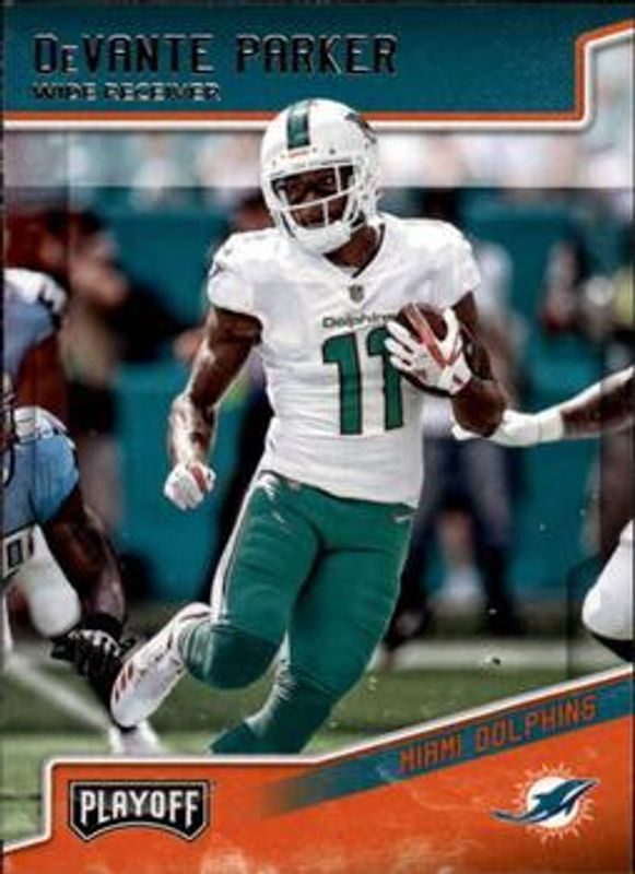 The DeVante Parker 2018 Playoff #117 Base card is 1 of 9 DeVante Parker's card variations in the 2018 Playoff set being tracked by Sports Card Investor, including Goal Line, Kickoff, Red Zone, 1st Down /99, and 2nd Down /49.