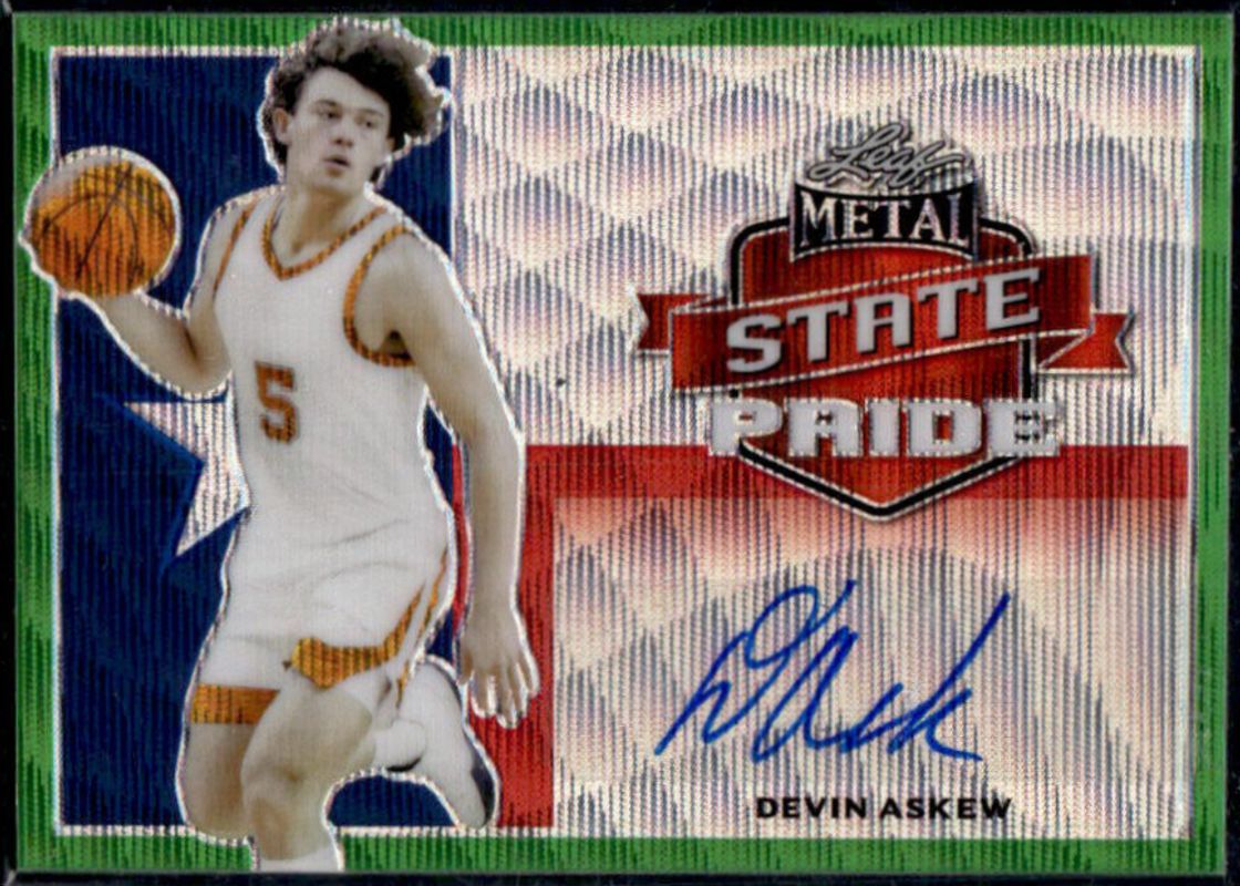 The Devin Askew 2021 Leaf Metal #SP-DA1 State Pride Autographs - Green Wave /7 card is 1 of 88 Devin Askew's card variations in the 2021 Leaf Metal set being tracked by Sports Card Investor, including Base, Silver Crystal, Silver Mojo, Silver Wave, and Blue Rainbow /50.
