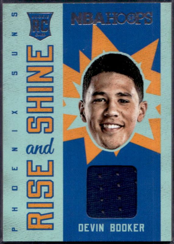 The Devin Booker 2015 Hoops #RS-DB Rise 'n Shine Rookie card is 1 of 17 Devin Booker's card variations in the 2015 Hoops set being tracked by Sports Card Investor, including Base, Gold, Green, Red Back, and Blue /399.