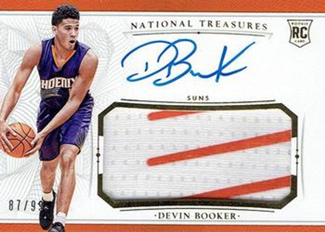 The Devin Booker 2015 National Treasures #113 Base /99 Rookie card is 1 of 23 Devin Booker's card variations in the 2015 National Treasures set being tracked by Sports Card Investor, including Rookie Patch Auto /99, Rookie Patch Auto - Silver /25, Rookie Patch Auto - Gold /10, Rookie Patch Auto - Emerald /5, and Rookie Patch Auto - Logoman /1.