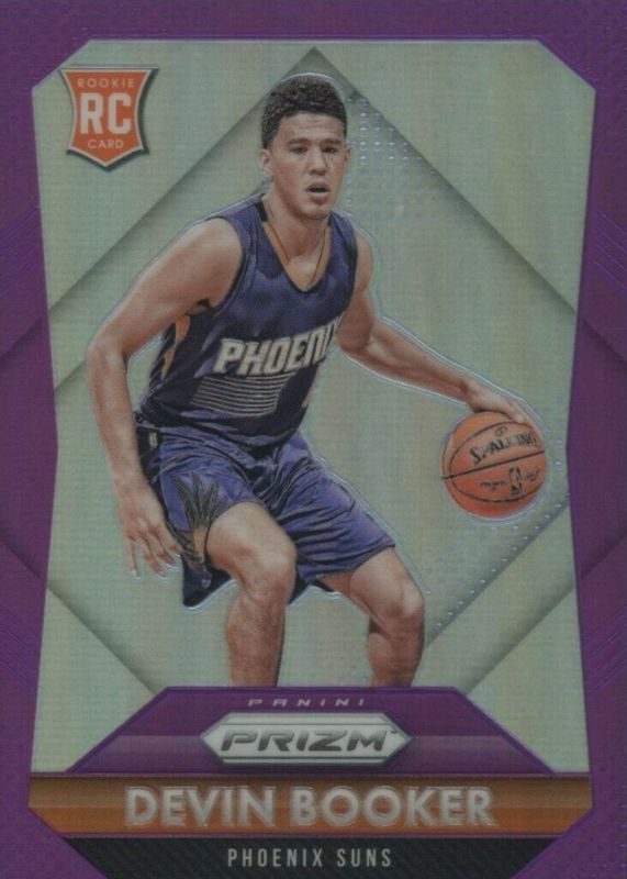 The Devin Booker 2015 Prizm #308 Purple /99 Rookie card in Raw condition has moved up $270 (+42.9%) in the last 30 days and was last sold for $900.00 .