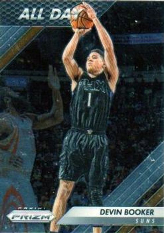 The Devin Booker 2016 Prizm #10 All Day card is 1 of 34 Devin Booker's card variations in the 2016 Prizm set being tracked by Sports Card Investor, including Base, Green, Ruby Wave, Silver, and Starburst.