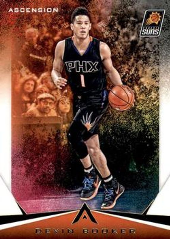 The Devin Booker 2017 Ascension #44 Base card is 1 of 11 Devin Booker's card variations in the 2017 Ascension set being tracked by Sports Card Investor, including Blue /125, Red /75, Green /25, Black /1, and Making History.