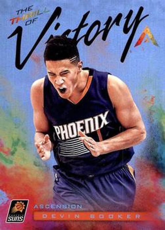 The Devin Booker 2017 Ascension #TOV3 The Thrill of Victory card is 1 of 11 Devin Booker's card variations in the 2017 Ascension set being tracked by Sports Card Investor, including Base, Blue /125, Red /75, Green /25, and Black /1.